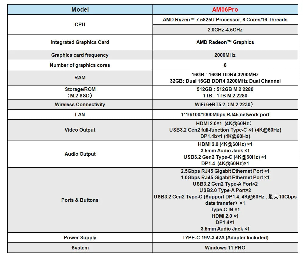 ACEMAGIC AM06Pro Mini PC Ryzen 7 5825U 16GB RAM 512GB SSD Turbo Boost up to 4.5GHz M.2 2230 WiFi 6+BT5.2 Supports 3-screen displ