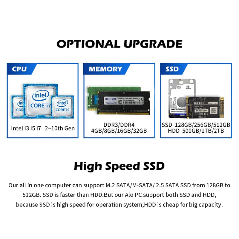 The BLCOOF B06 is a comprehensive all-in-one desktop solution engineered for demanding computing tasks. This 24-inch integrated system combines an Intel Core i7-4700S processor with quad-core architecture running at 3.6GHz, delivering robust performance for professional and gaming applications. The unit features 8GB or 16GB DDR3 RAM paired with a 1TB SSD, ensuring rapid data access and seamless multitasking. Its 1920x1080 LCD display with 16:9 aspect ratio provides sharp visuals for extended work sessions. The integrated HD Graphics chipset handles everyday graphics requirements efficiently. Equipped with an H81 chipset, CD-RW drive, and pre-installed Windows 10, this system arrives ready for immediate deployment. The included keyboard and mouse complete the package, making it an ideal choice for office environments, business operations, and home computing needs. Weighing just 6.5kg, it combines power with practical portability.