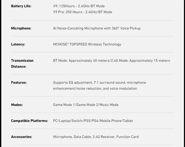 MCHOSE V9 Pro Wireless Gaming Headset Surround Sound Headphones Noise Canceling Mic Low Latency Lightweight for PS5 PC SWITCH
