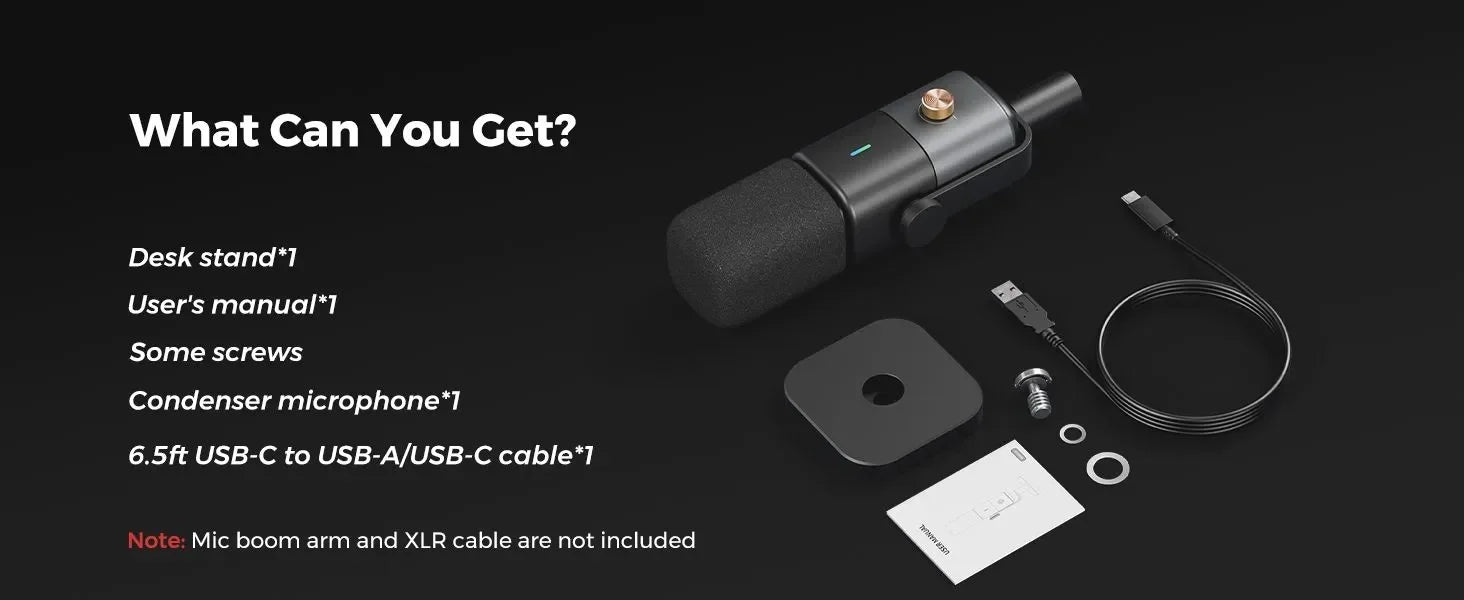 Package Includes: Desk stand*1, User's manual*1, Some screws, Condenser microphone*1, 6.5ft USB-C to USB-A/USB-C cable*1