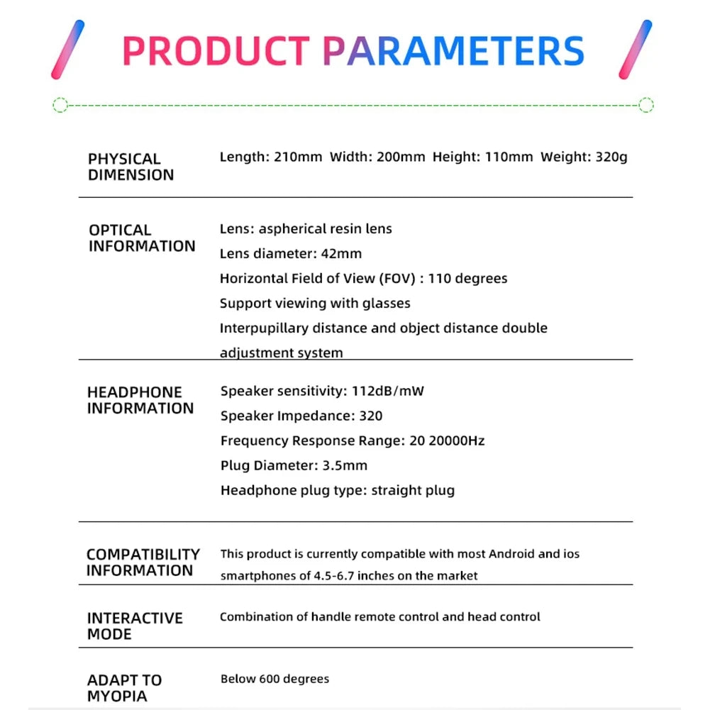 Las gafas VRPARK J60 son un visor de realidad virtual binocular diseñado para disfrutar de juegos y vídeos inmersivos en smartphones. Este dispositivo VR todo en uno cuenta con conectividad Bluetooth para el emparejamiento inalámbrico de mandos y ofrece un amplio campo de visión para contenido 3D envolvente. Compatible con la mayoría de smartphones, incluye batería y se presenta como un sistema completo de gafas. El visor admite reconocimiento de gestos y está diseñado para proporcionar una experiencia visual inmersiva tanto para jugadores ocasionales como para entusiastas de la realidad virtual que buscan entretenimiento accesible sin necesidad de estaciones base externas ni conexión a un ordenador.