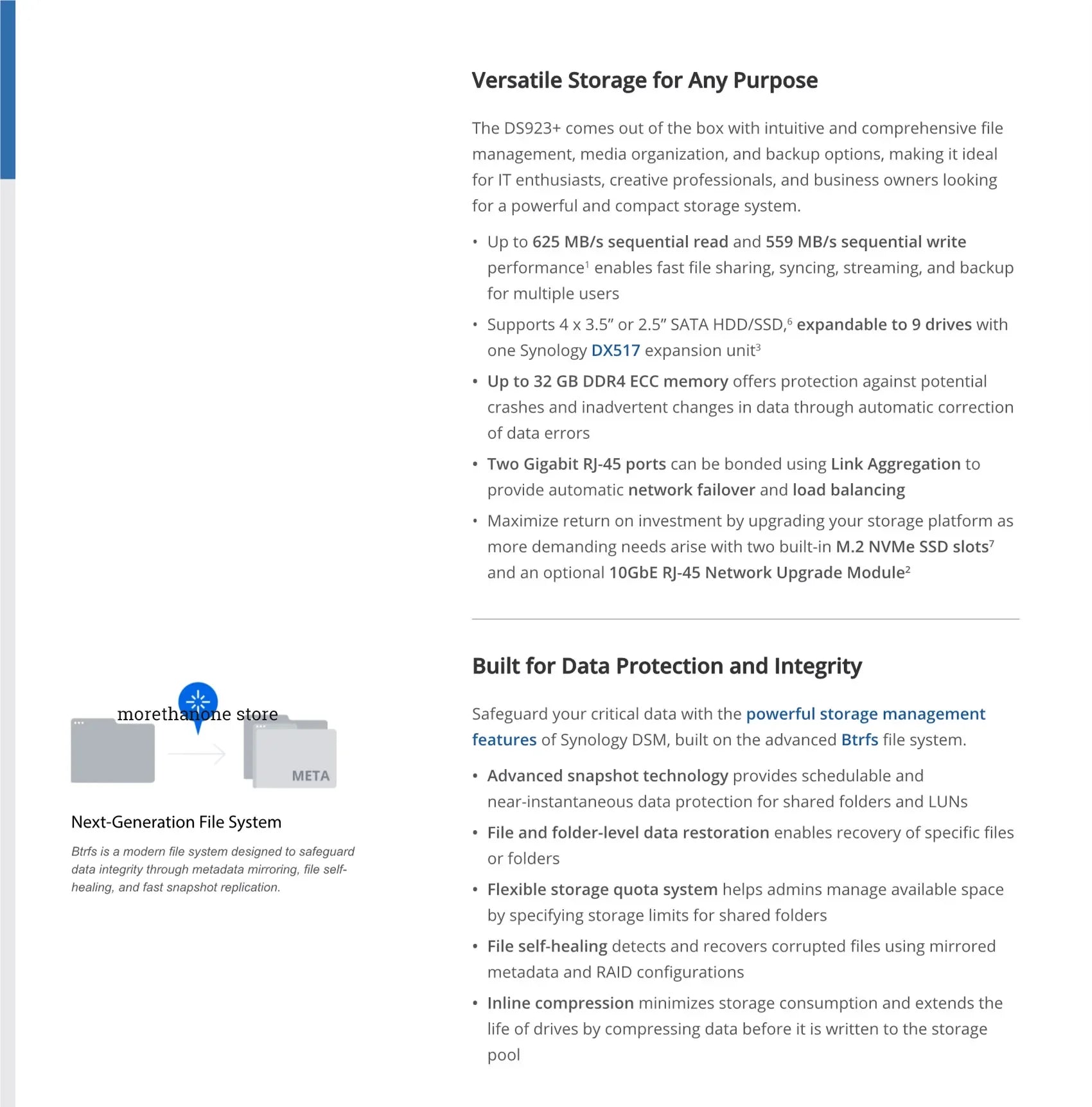 The Synology DS923+ is a professional-grade 4-bay NAS solution equipped with 8GB RAM for robust network storage and data management. This diskless enclosure supports capacities from 1.5TB to 4TB and connects via dual RJ-45 Gigabit ports, USB, and eSATA interfaces for seamless integration into existing infrastructure. Engineered to international CE standards with no hazardous chemical substances, it delivers sustained throughput of 1000 MB/s. Purpose-built for organizations requiring centralized data protection, collaborative file access, and reliable cloud-connected storage capabilities.
