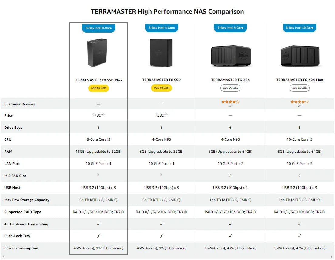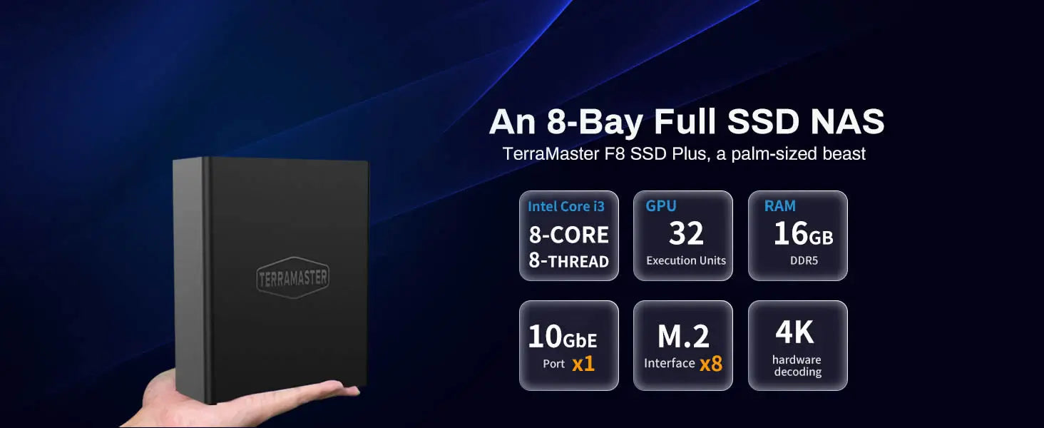 TERRAMASTER F8 SSD Plus NAS - 8Bay All SSD Core i3 8-Core 8-Thread CPU, 16GB RAM, Palm-Sized Network Attached Storage (Diskless)