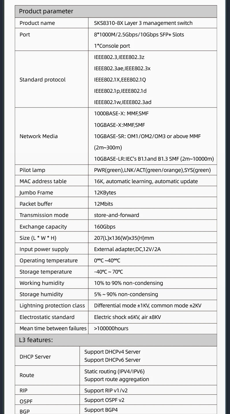 The XikeStor SKS8310-8X is a professional-grade Layer 3 managed switch engineered for high-performance network environments. Featuring 8 ports of 10G SFP+ connectivity, it delivers 160 Gbps switching capacity with advanced packet forwarding at 119.05 Mpps. Built with the RTL9303 control chipset, this external switch supports DHCP, VLAN configuration, port and link aggregation for flexible network topology. Its 12 KB jumbo frame support and 12 Mbps packet buffer optimize throughput for demanding applications. Equipped with intelligent fan-based thermal management and powered by a compact 12V DC supply, the unit operates efficiently while maintaining reliable heat dissipation. Web and CLI management interfaces provide full administrative control. CE, FCC, RoHS, and PSE certified for global deployment.