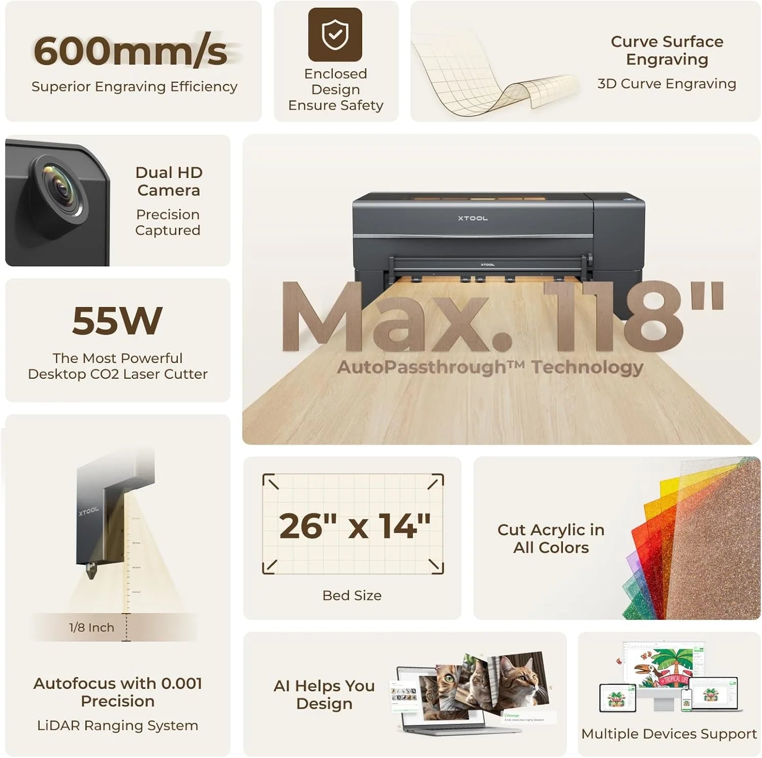 Xtool P2S 55W CO2 Laser Cutter All-In-1 Desktop Engraver Machine for Metal Leather Glass Acrylic Paper-New Condition